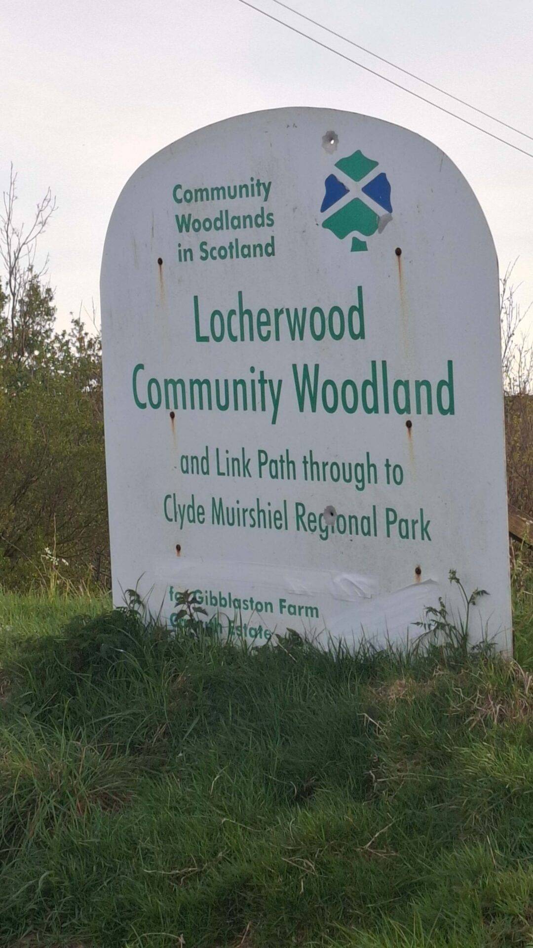A white outdoor sign on a grassy verge, providing information about Locherwood Community Woodland and its connection to Clyde Muirshiel Regional Park.